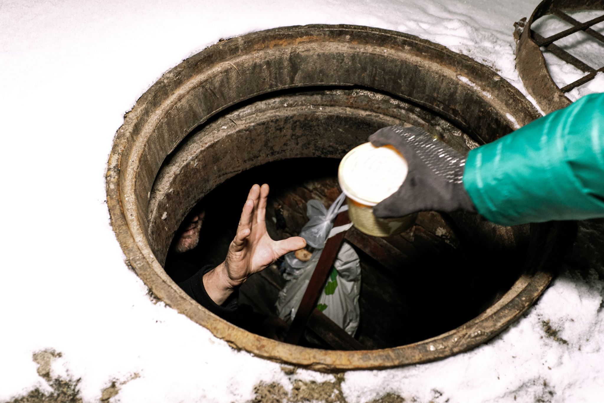 Na zdjęciu moment spotkania jednego z naszych wolontariuszy z osobą żyjącą w kanale i przekazanie jej gorącej zupy